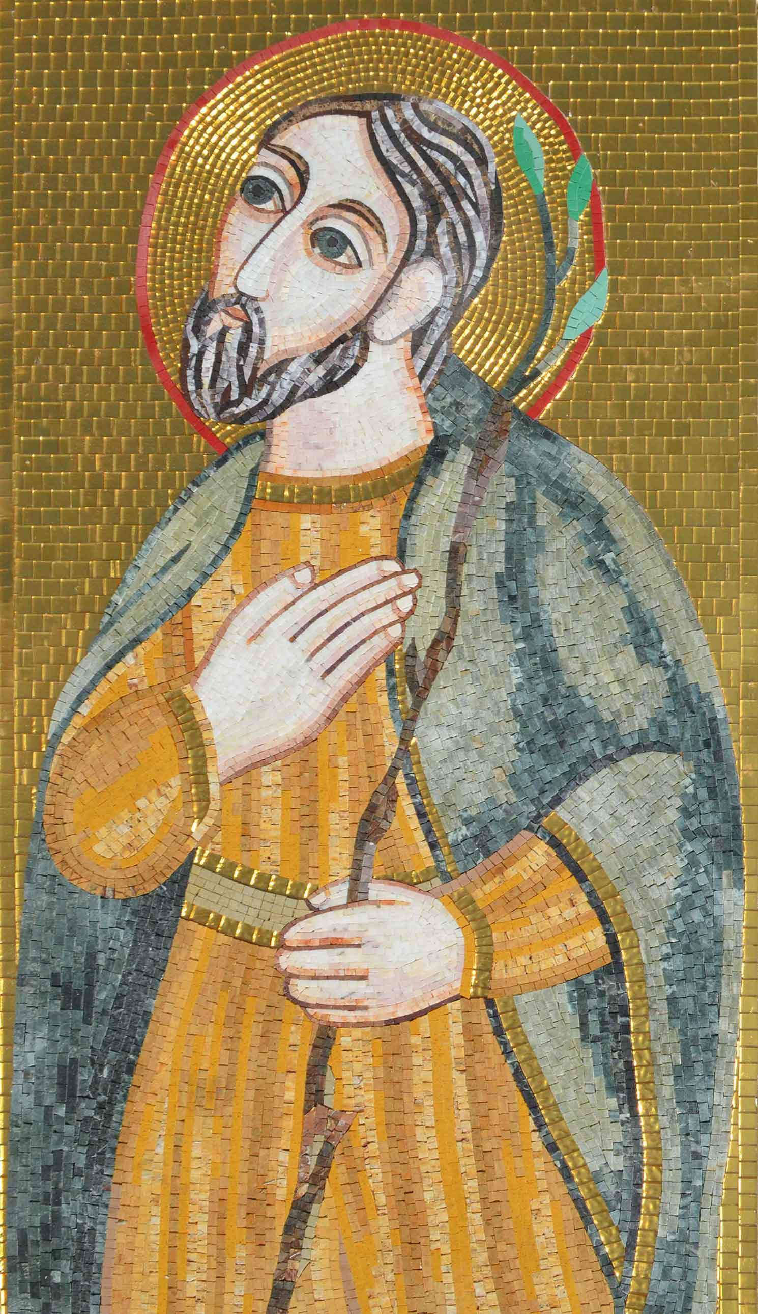 Saint Joseph, known as the protector and patron of workers and families, is depicted in a serene pose with one hand placed gently on his chest, symbolizing his deep faith and commitment. His other hand holds a stick, representing strength and guidance in life's journey. This powerful imagery makes this mosaic not just a decorative piece but a meaningful representation of devotion and spirituality.