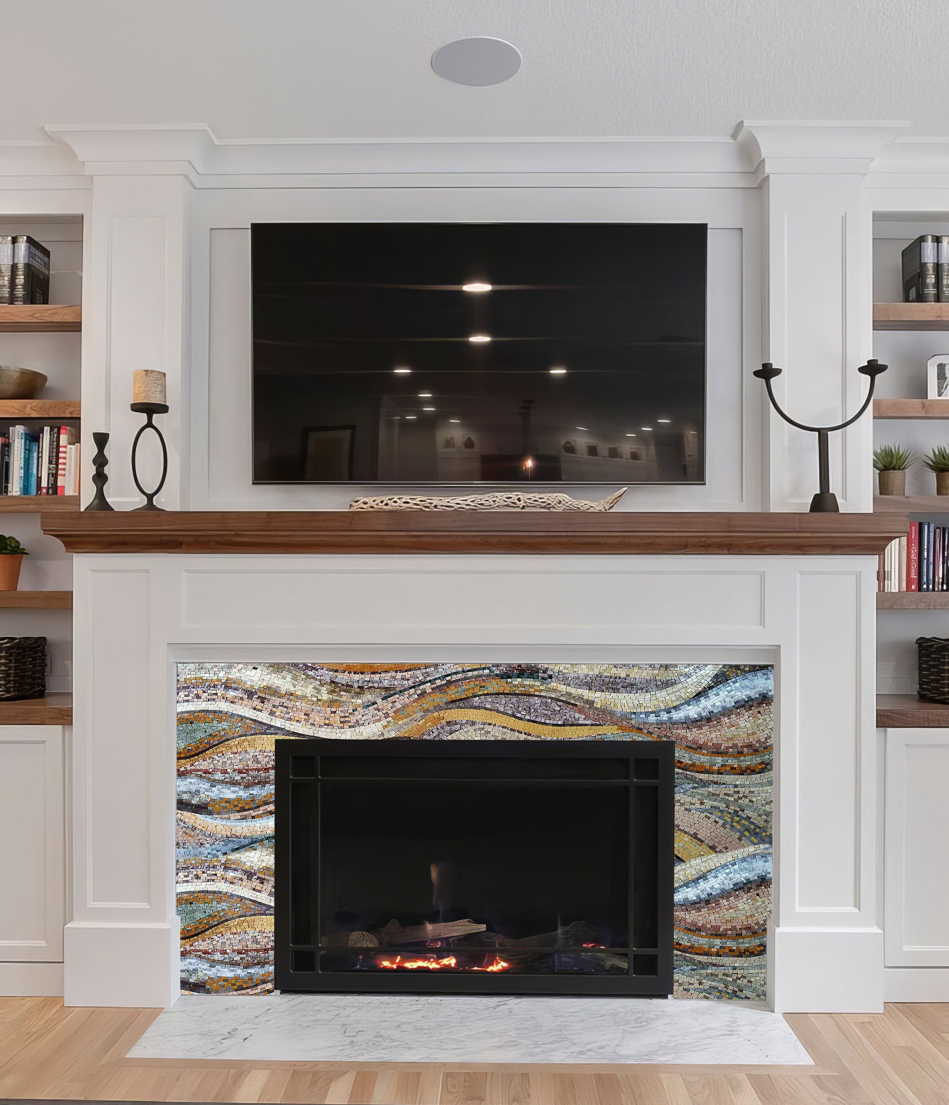 Whether you are entertaining guests or enjoying a quiet evening by the fire, the "Mosaic Fireplace - Autumn Waves" enhances the experience, making your fireplace a welcoming refuge. The rich, warm tones evoke the essence of autumn, wrapping you in comfort and serenity as the flames dance within your hearth.