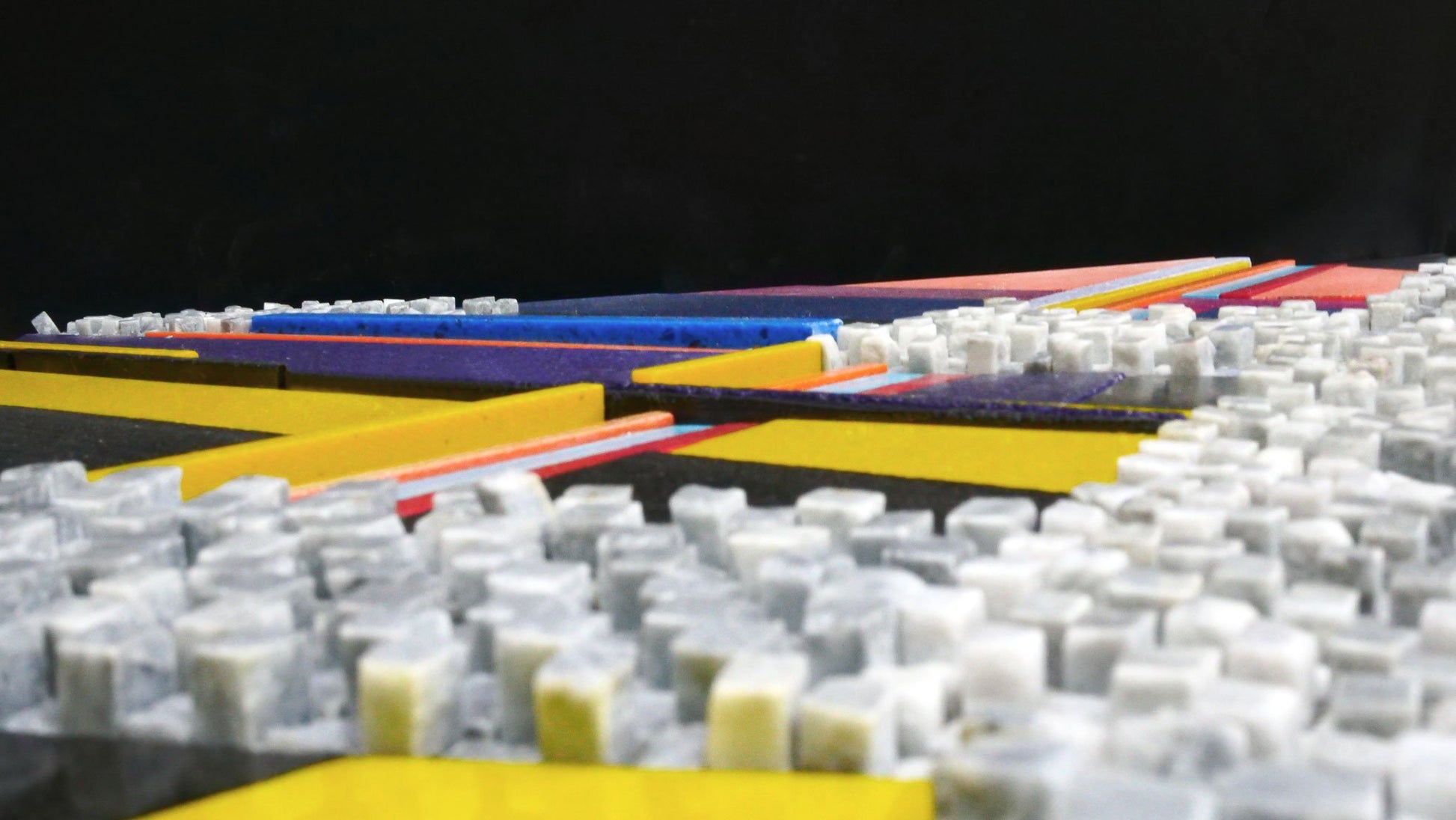 As you delve deeper into the artwork, you'll discover the intriguing textures that further enhance its appeal. The jagged, dull surfaces of the gray cubes almost invite you to reach out and touch them, offering a tactile contrast to the smooth, flowing forms that surround them. This interplay of coarse and polished surfaces creates a layered effect, giving the piece a three-dimensional quality that transforms your space, whether it’s displayed in a gallery setting or as a statement piece in your home.