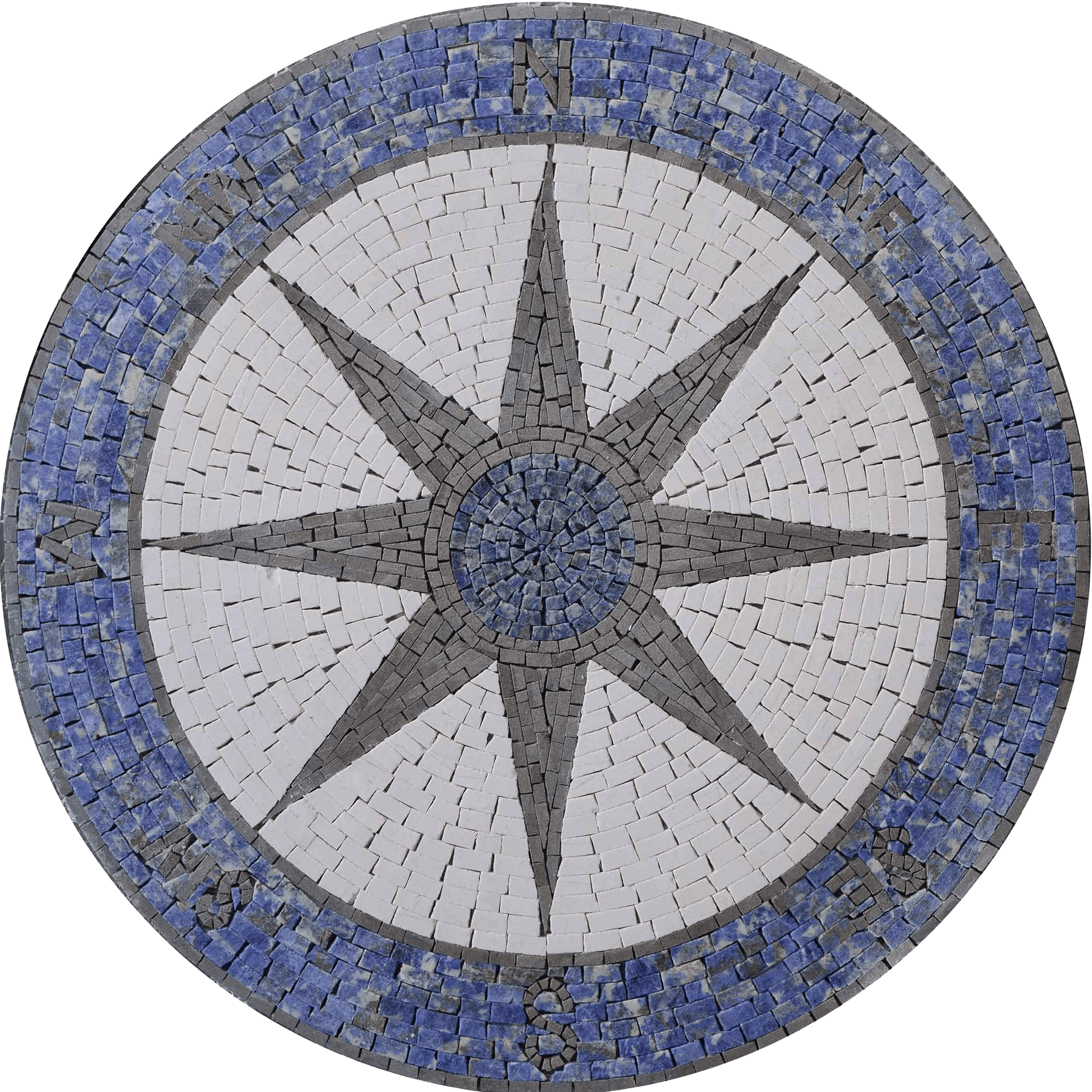 Introducing the Ocean's Pearl - Compass Mosaic Medallion, a stunning piece of artistry that brings together the harmonious colors of sandy hues and deep blues, creating a visual masterpiece that will inspire and guide you for a lifetime. This exquisite mosaic is not just a decorative item; it is a symbol of adventure, hope, and the unyielding spirit of exploration that resides within us all.