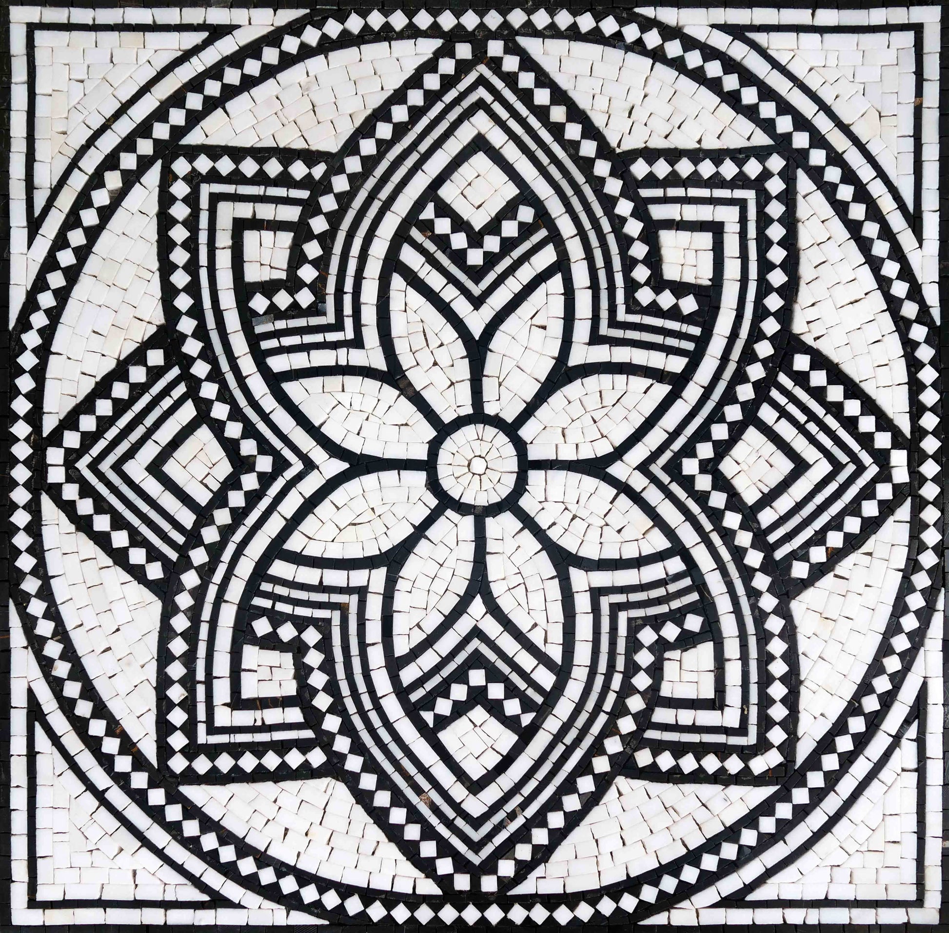 Exhibiting both remarkable complexity and timeless elegance, this square mosaic art features an ornamental design composed of seemingly interwoven geometric shapes and stylized floral motifs, rendered in classic black and white stone tiles. Handcrafted with meticulous attention to detail, the intricate pattern creates a visually rich and sophisticated artwork, bearing a resemblance to mandala designs with its radial symmetry and layered complexity. The precise placement of each tile contributes to the overall harmony and visual impact of this striking piece.