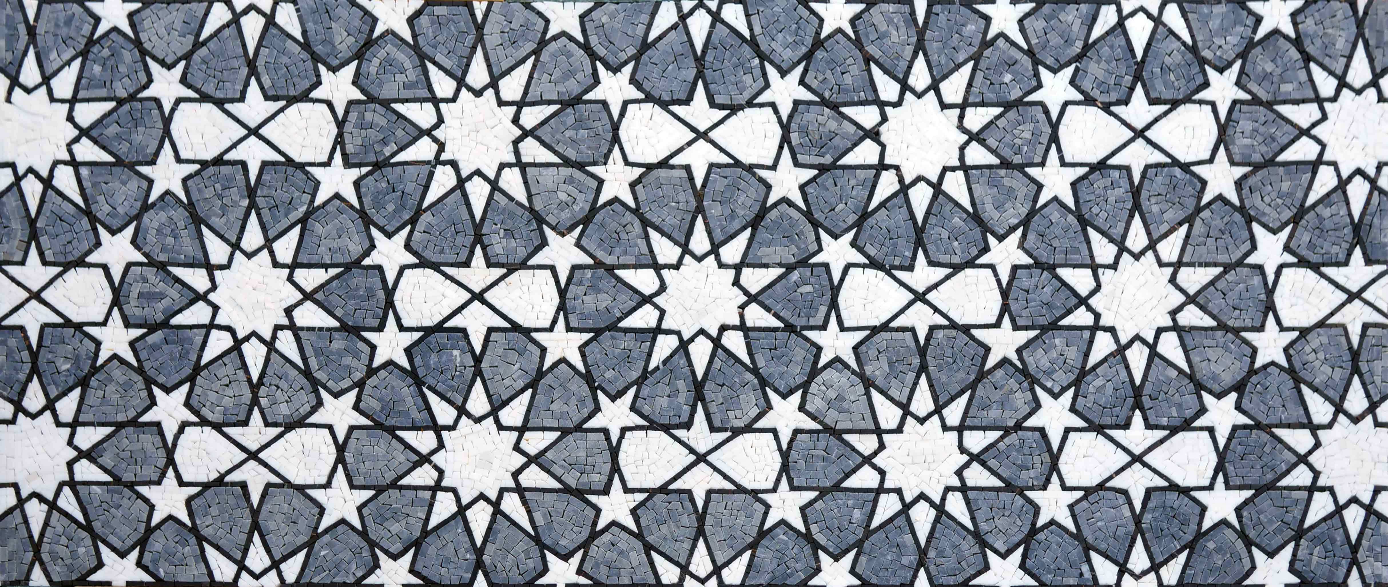 A mesmerizing mosaic artwork that showcases a captivating pattern of interlocking stars, a testament to the beauty of geometric design. The contrasting tones of grey and white create a visually dynamic composition, drawing the viewer's eye across the intricate network of shapes. This mosaic is a celebration of symmetry and precision, its timeless design adding a touch of elegance and sophistication to any space.