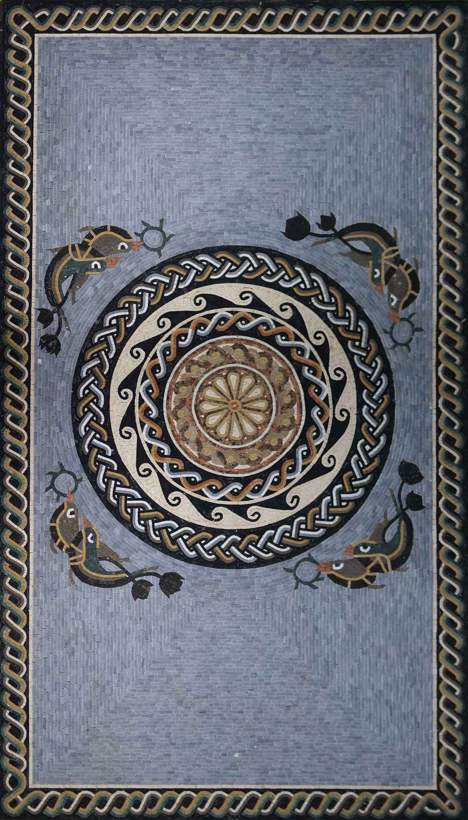 Transform your space with our stunning "Medieval Fish - Mosaic Wall Art," a captivating piece that seamlessly blends artistry and nature. This unique mosaic features a beautifully crafted medallion at its center, surrounded by an intricate design of gracefully swimming fish. The geometric composition creates a sense of movement and harmony, making it a striking focal point in any room.