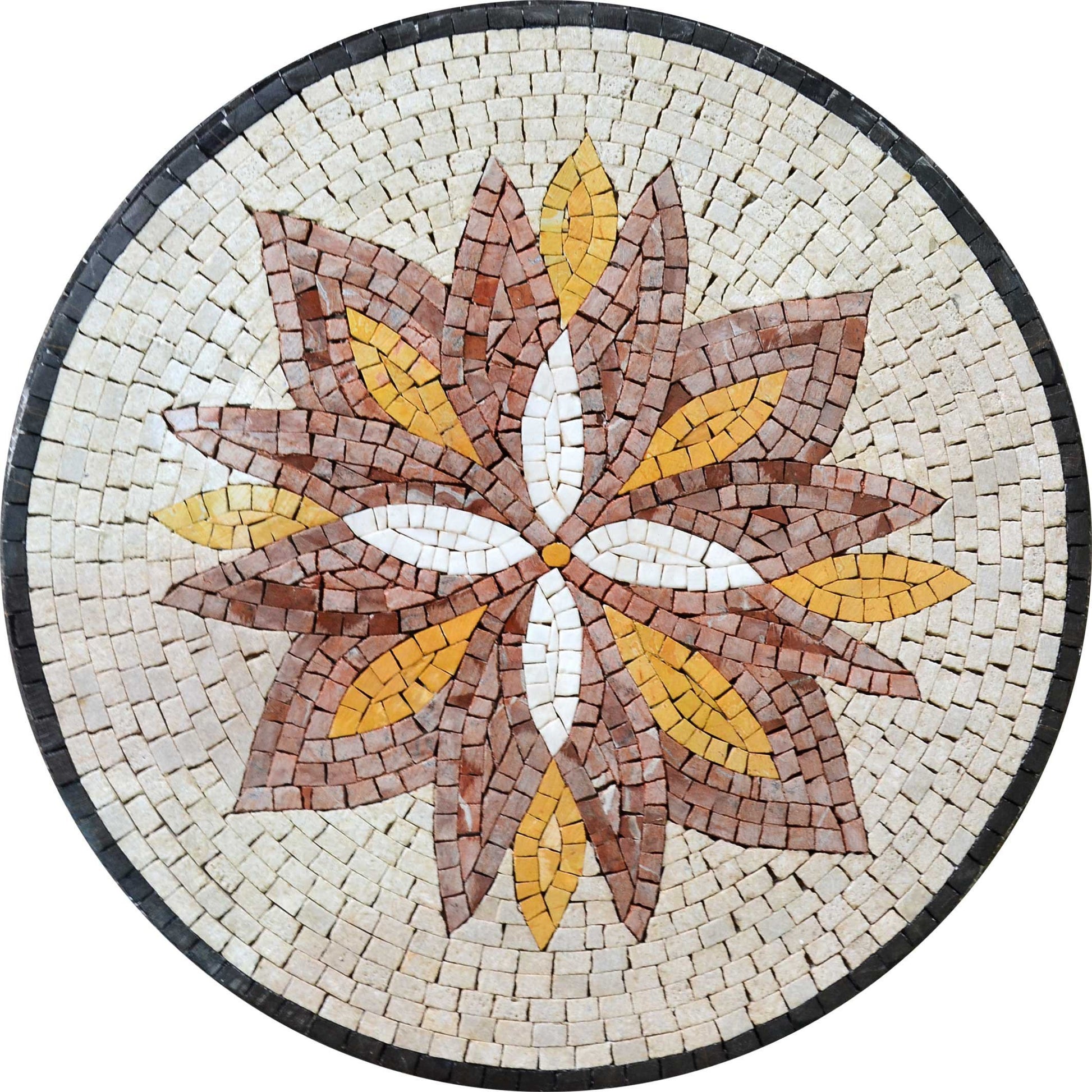 Crafted with the utmost care, this medallion mosaic is made from natural stones and handcut tiles, showcasing the artisanship and dedication that go into each piece. The unique textures and colors of the stones not only bring the flower to life but also ensure that no two mosaics are exactly alike, resulting in a one-of-a-kind addition to your home decor.