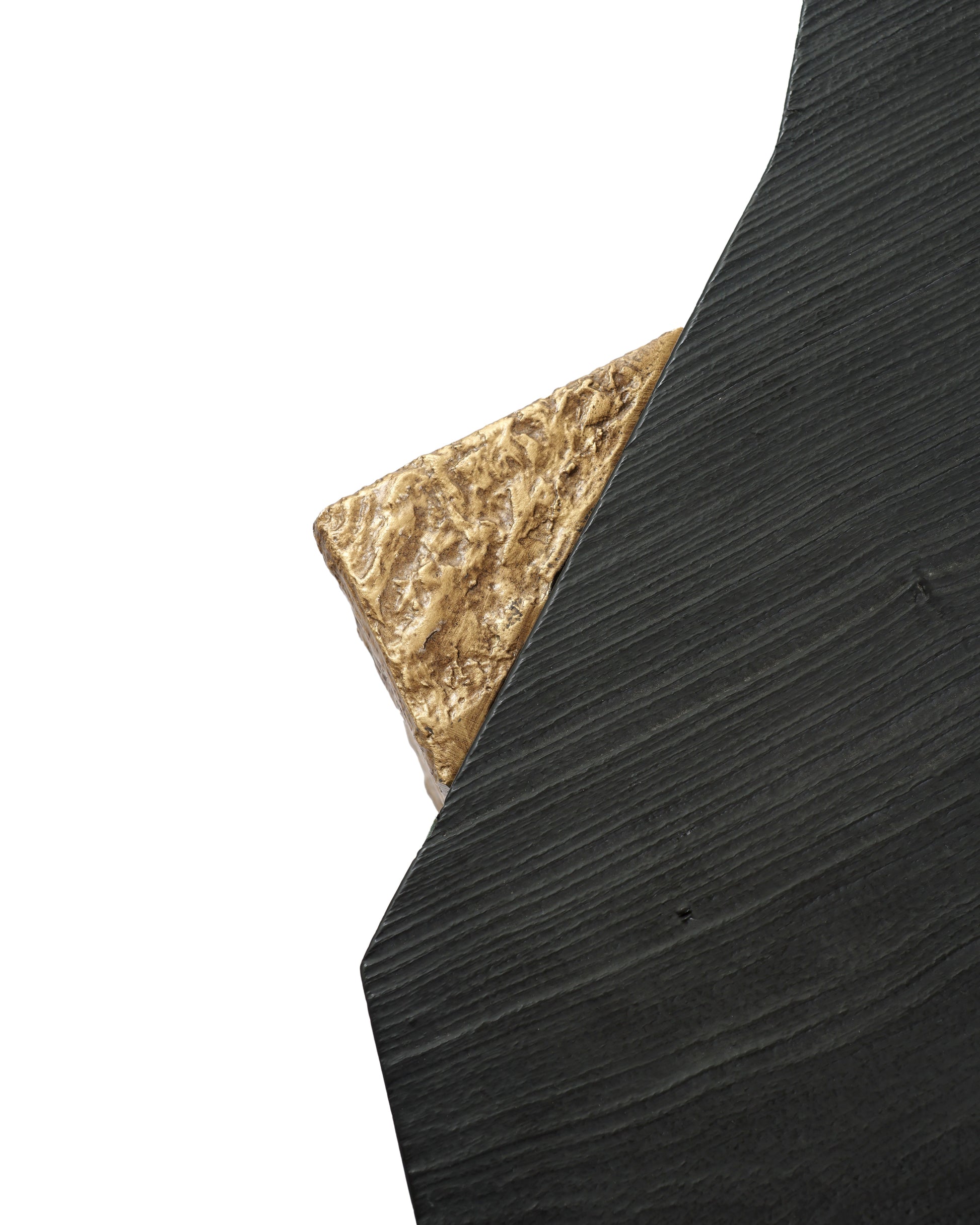 The table features a unique hand-applied textured patination in luxurious gold and black hues, imbuing it with a high-class aesthetic that effortlessly exudes sophistication. Each tabletop is truly one-of-a-kind due to the artisanal nature of its creation, ensuring that no two pieces are exactly alike. This attention to detail and commitment to quality make the Handcrafted Mosaic Wood Side Table a perfect statement piece for any setting, whether it’s your living room, bedroom, or office.
