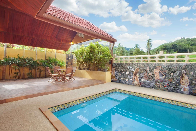 A Gorgeous scene of mermaids bathing in the lake surrounded by water flowers and plants.It is composed of all natural stones and hand-cut art tiles. This stone art is completely hand-made.Amazing!!