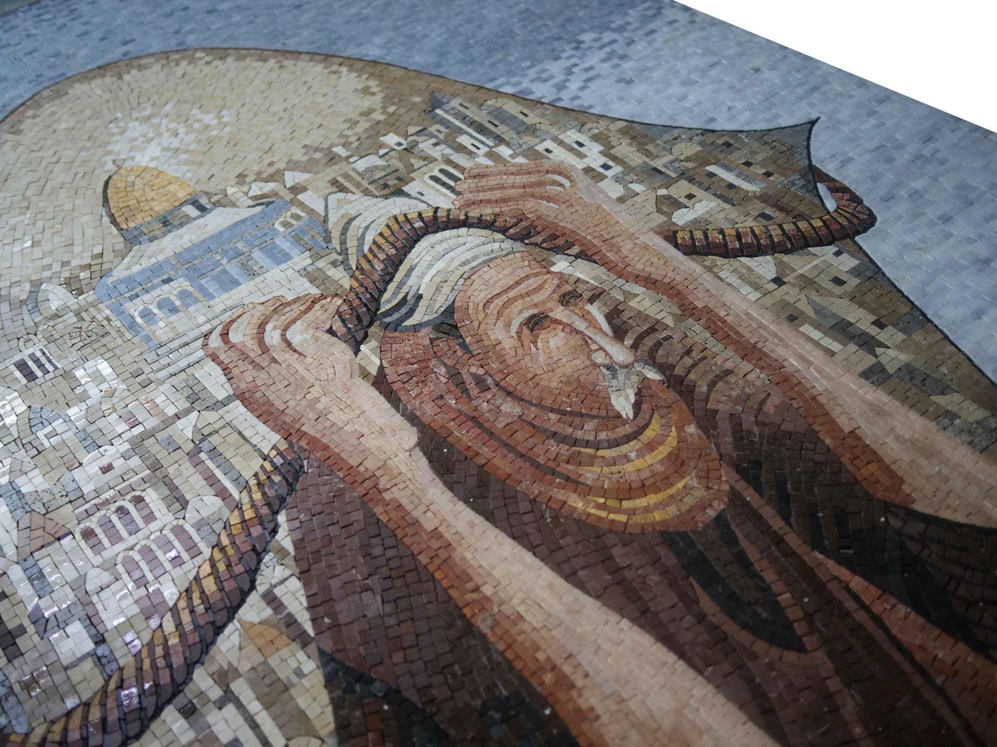 Each piece of the "Camel of Hardships" is meticulously handcrafted by skilled artisans, ensuring that every detail is captured with precision and care. The artwork features a striking depiction of an elderly Palestinian man, symbolizing the weight of heritage he carries—his story intertwined with the land he loves and the eternal struggles faced by his people. The mosaic beautifully incorporates elements that represent the iconic Al-Aqsa Mosque, grounding the piece in the rich history and cultural significance of Jerusalem.