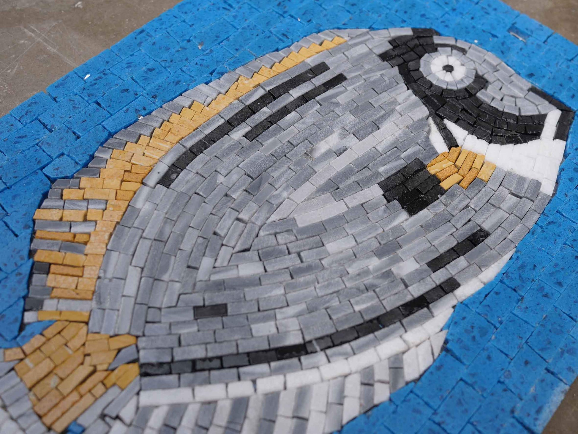 The Blue Tang, known for its striking colors and graceful movements, is beautifully captured in this mosaic representation. Whether you choose to display it on your wall or as a standout piece on your floor, this artwork is sure to evoke a sense of tranquility and connection to nature. The diversity in textures and hues of the stones and tiles creates a dynamic visual experience, making this piece a focal point in any room, from living areas and hallways to offices and nurseries.