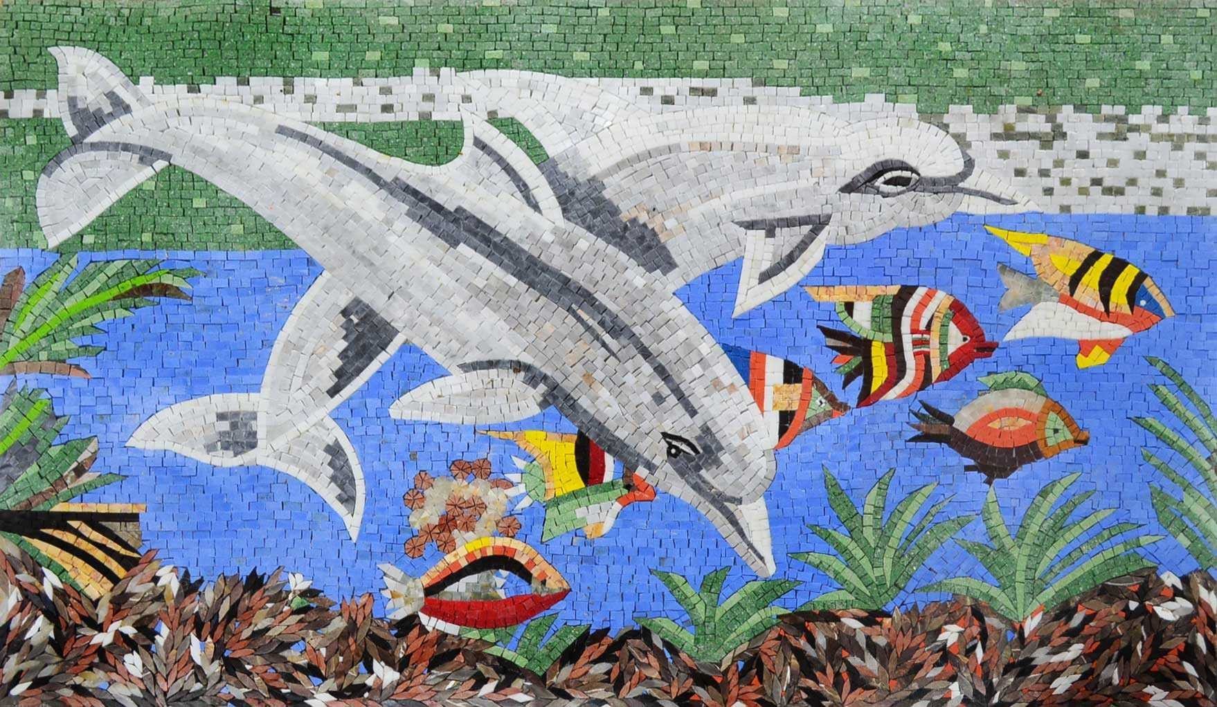 Expertly composed of natural stones and hand-cut tiles, this artwork is not only a testament to skilled craftsmanship but also a celebration of nature's splendor. The meticulous attention to detail ensures that each dolphin and fish is portrayed with the utmost care, creating a visual narrative that is both dynamic and calming.