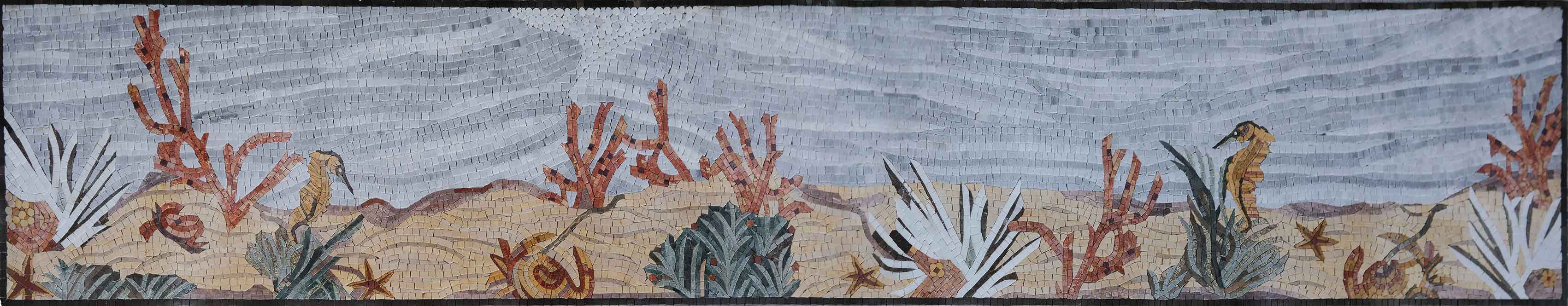 Crafted entirely by hand, this mosaic art showcases intricately designed seahorses amidst vibrant coral and gentle algae, all composed using natural stones and meticulously hand-cut tiles. The predominant blues and tranquil colors are specifically chosen to evoke the calming essence of the sea, creating a peaceful ambiance in any setting.