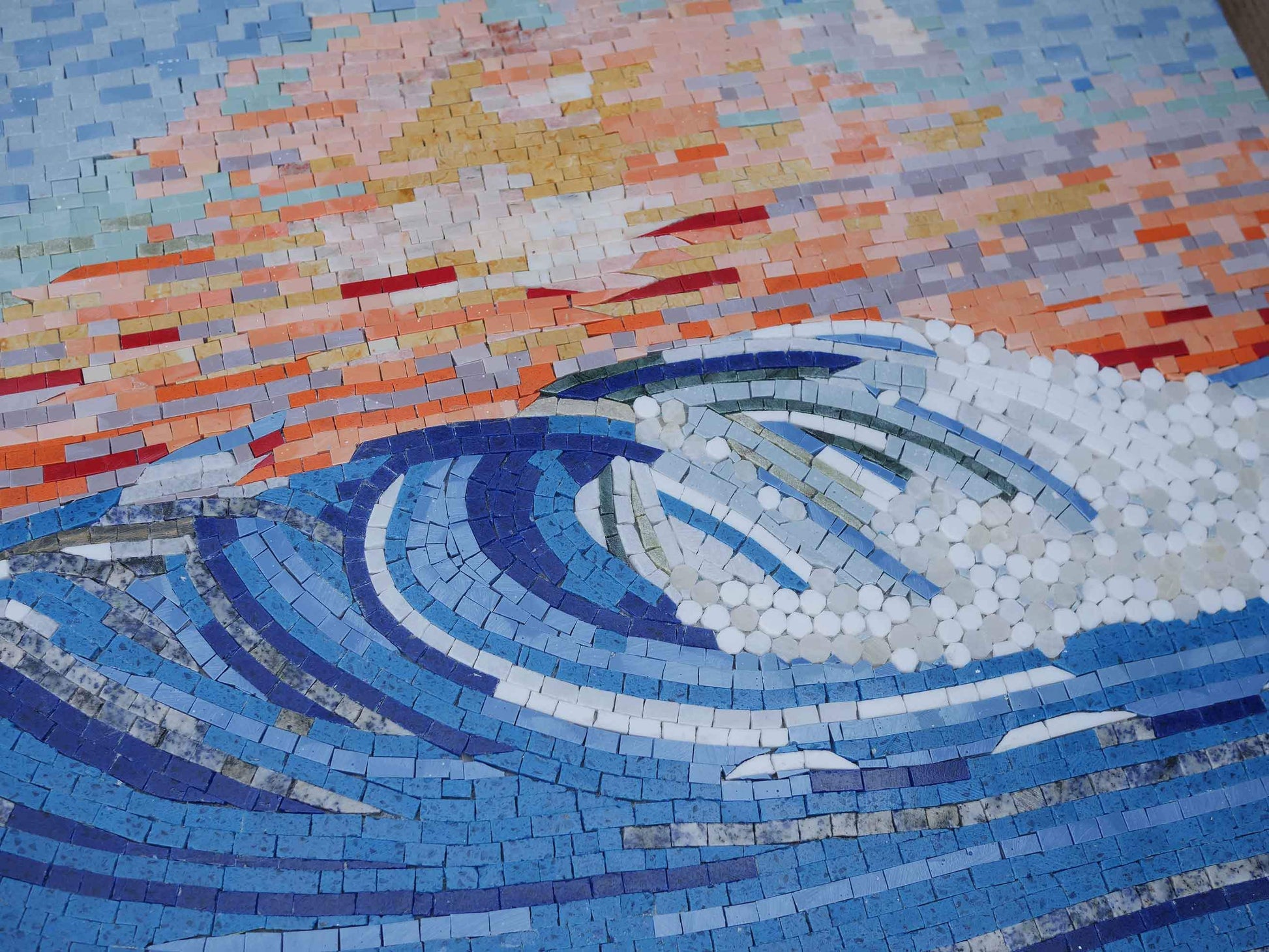 The Wave Mosaic is not only a visual masterpiece but also a source of inspiration. Its elegant curves symbolize the resilient spirit of the ocean waves, reminding us of the importance of perseverance in our daily lives. The soothing colors of blue and white, complemented by the warm sunset hues, evoke a sense of calmness and relaxation, making it the perfect addition to any environment.
