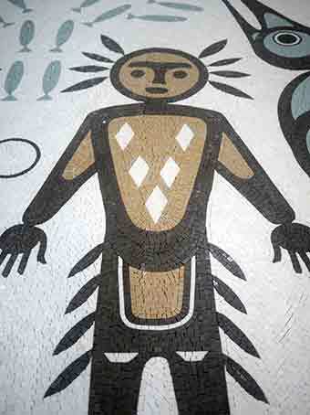 This striking mosaic floor draws inspiration from Indigenous art and cultural traditions. The circular design features stylized figures, animals, and symbols arranged in a harmonious composition. Four canoes, each carrying figures with elaborate headdresses, circle around a central motif of two figures flanked by herons. The vibrant colors and intricate details create a captivating visual narrative that celebrates the connection between humans, nature, and spirituality. This artwork invites viewers to contemplate the rich cultural heritage and enduring traditions of Indigenous peoples.
