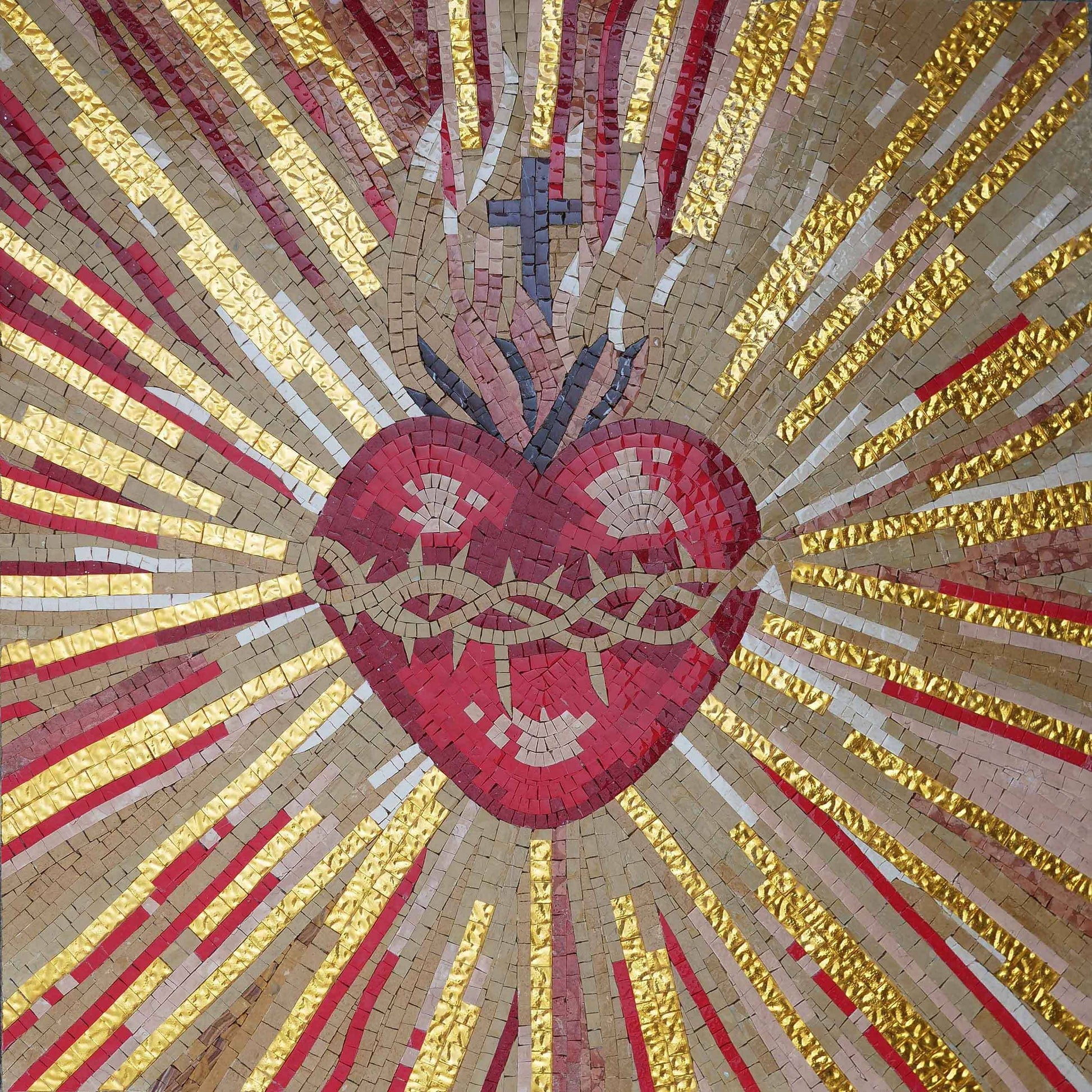 Handcrafted with meticulous care, each colorful tile is thoughtfully placed to create a captivating design that radiates warmth and compassion. This mosaic is not just an art piece; it's a statement of faith that brings inspiration and serenity to any space. Whether displayed in your home, church, or garden, it enhances your surroundings while inviting reflection on the profound spiritual significance of the Sacred Heart.