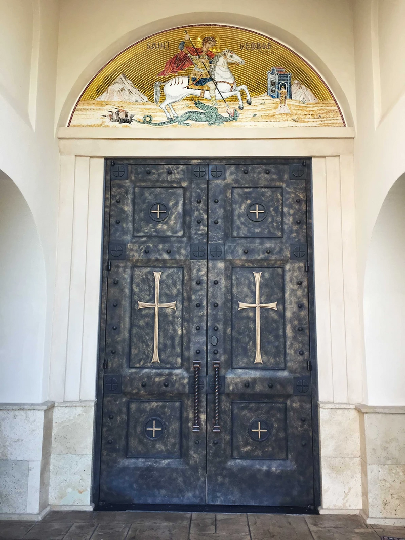 Each piece of this mosaic is meticulously crafted using premium materials sourced from around the globe, ensuring that every detail reflects our commitment to quality and artistry. The centerpiece of this captivating artwork is the brilliant golden glass background, which serves to illuminate the figure of St. George, creating a mesmerizing contrast that draws the eye. The rich textures of the marble tiles add depth and sophistication, making this mosaic a true statement piece.