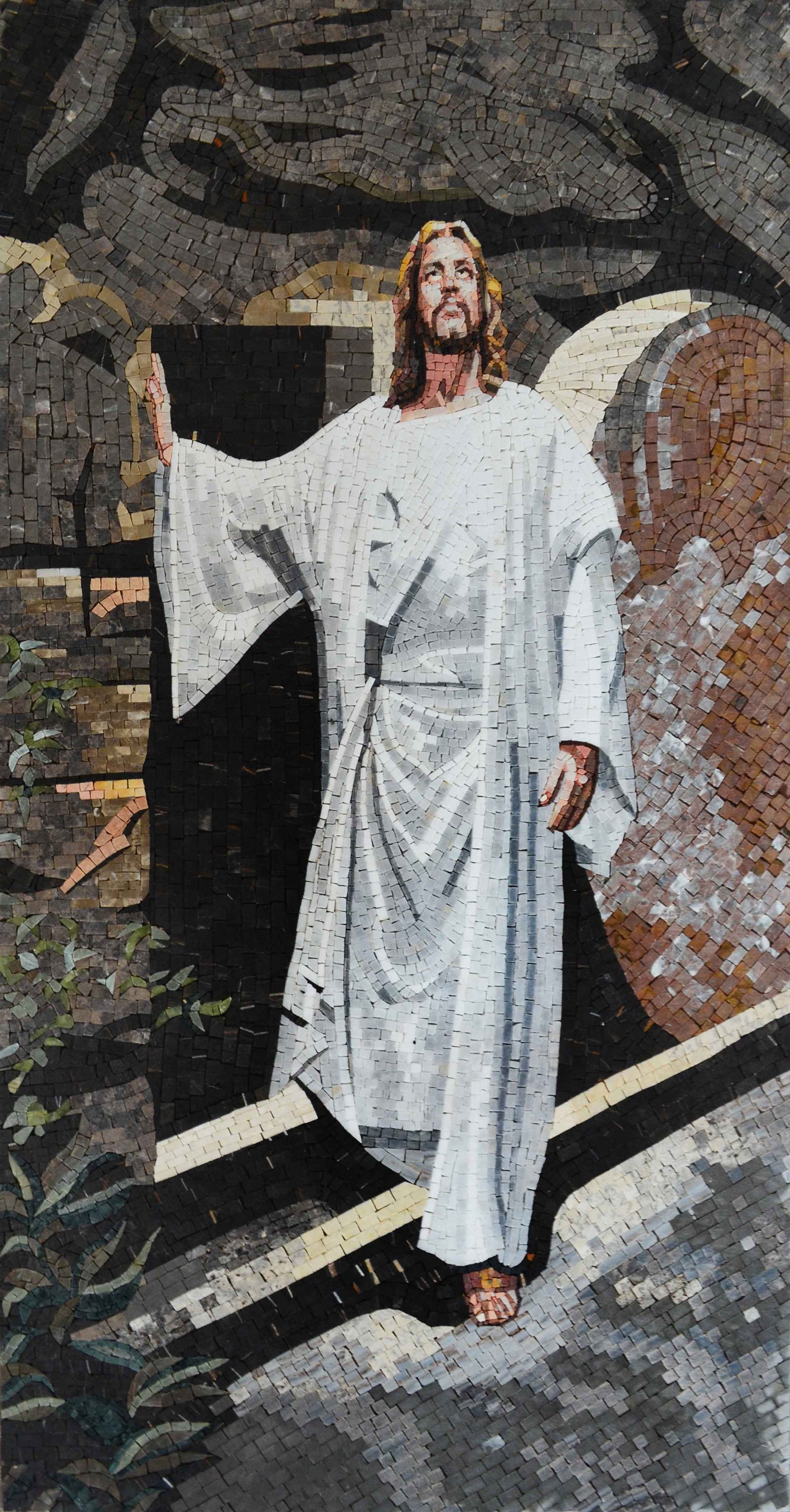 Crafted from all-natural marble, each piece of this mosaic is meticulously selected for its unique textures and colors, ensuring that no two mosaics are the same. The use of high-quality marble not only adds a touch of elegance to your space but also enhances the durability and longevity of the artwork. This mosaic serves as a beautiful representation of faith, making it an ideal addition to any home, church, or spiritual space.