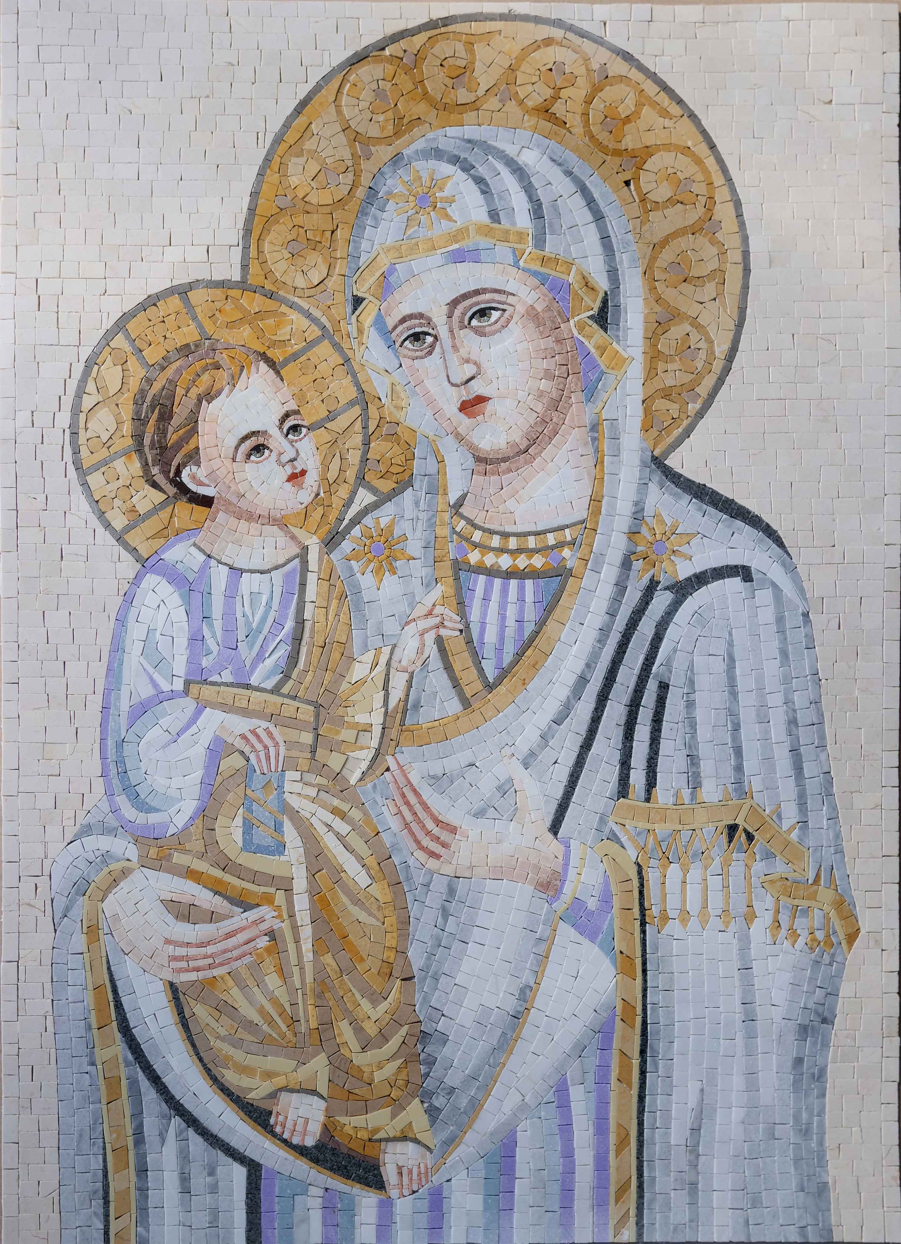 Crafted with precision, the "Mary and Jesus - Mosaic Art" features natural and hand-cut stones that come together to form a visually captivating image. The intricate details and vibrant colors breathe life into this sacred portrayal, making it an ideal addition to any religious setting. Whether in an Orthodox church, a prayer area, or a personal sanctuary, this mosaic serves as a powerful reminder of faith, love, and maternal grace.