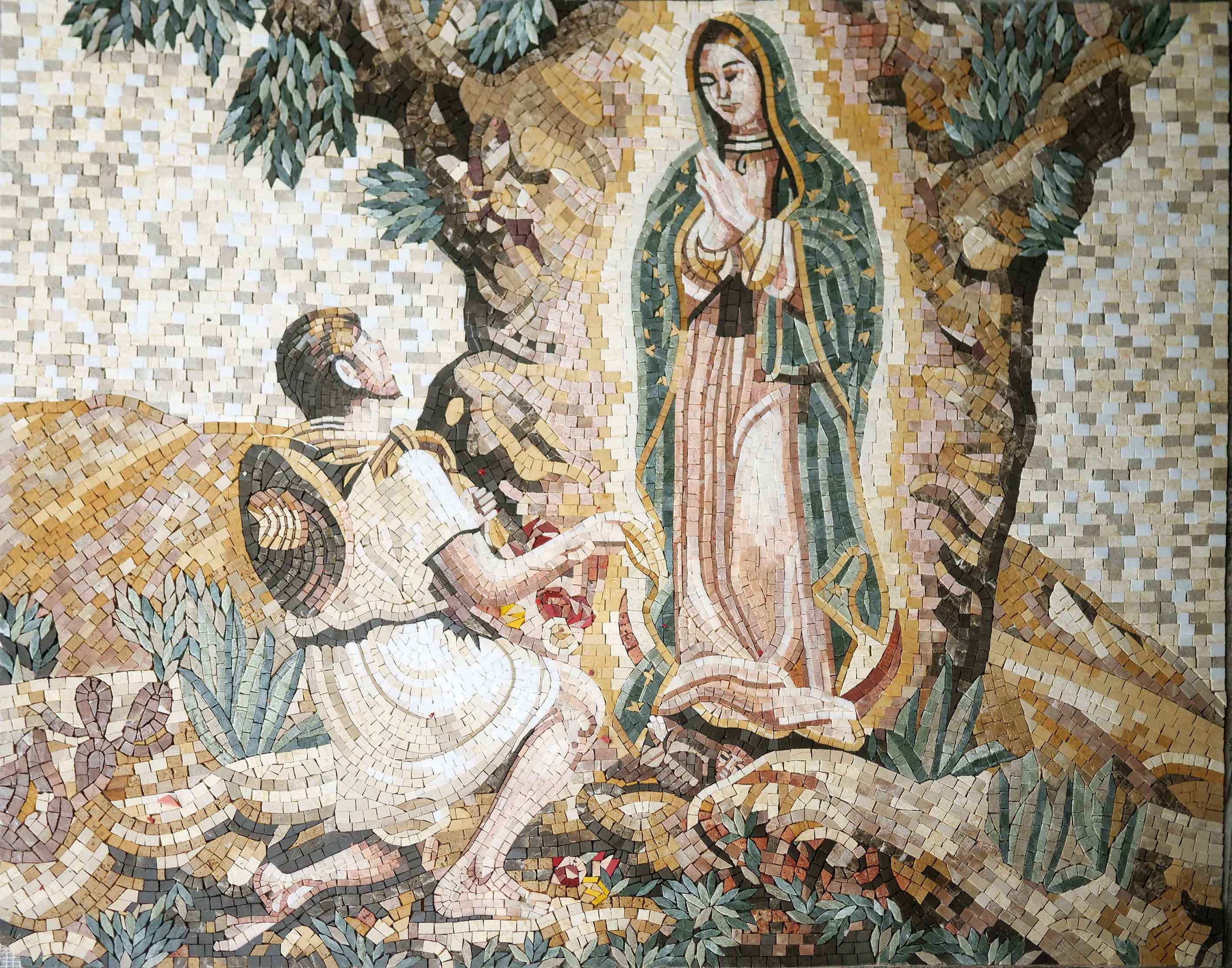 It is not just a decorative piece; it is a statement of belief that resonates with many. With its impeccable craftsmanship and deep-rooted significance, this mosaic invites admiration and reflection. Elevate your surroundings with the spiritual essence of Our Lady of Guadalupe and embrace the warmth and inspiration that this remarkable religious artwork brings to your life.