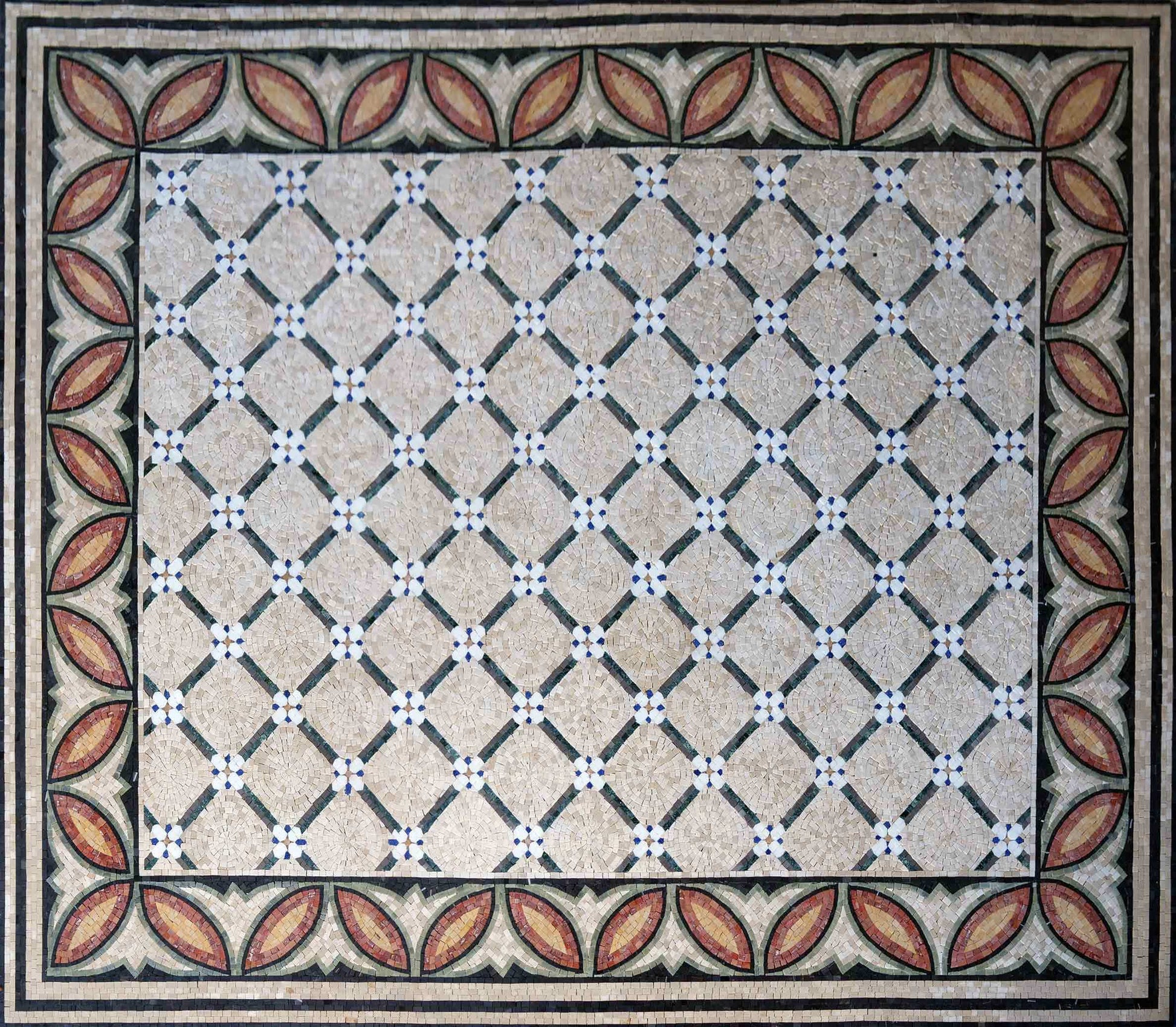 Handcrafted from natural marble and stone, the rug showcases a captivating geometric pattern inspired by traditional Victorian tilework. The intricate lattice design, composed of meticulously arranged tesserae, creates a sense of depth and visual intrigue. A delicate floral border, reminiscent of Victorian wallpaper motifs, frames the central pattern, adding a touch of softness and organic beauty. The harmonious blend of colors, including warm creams, earthy browns, and deep greens, evokes the rich palette characteristic of the Victorian era.