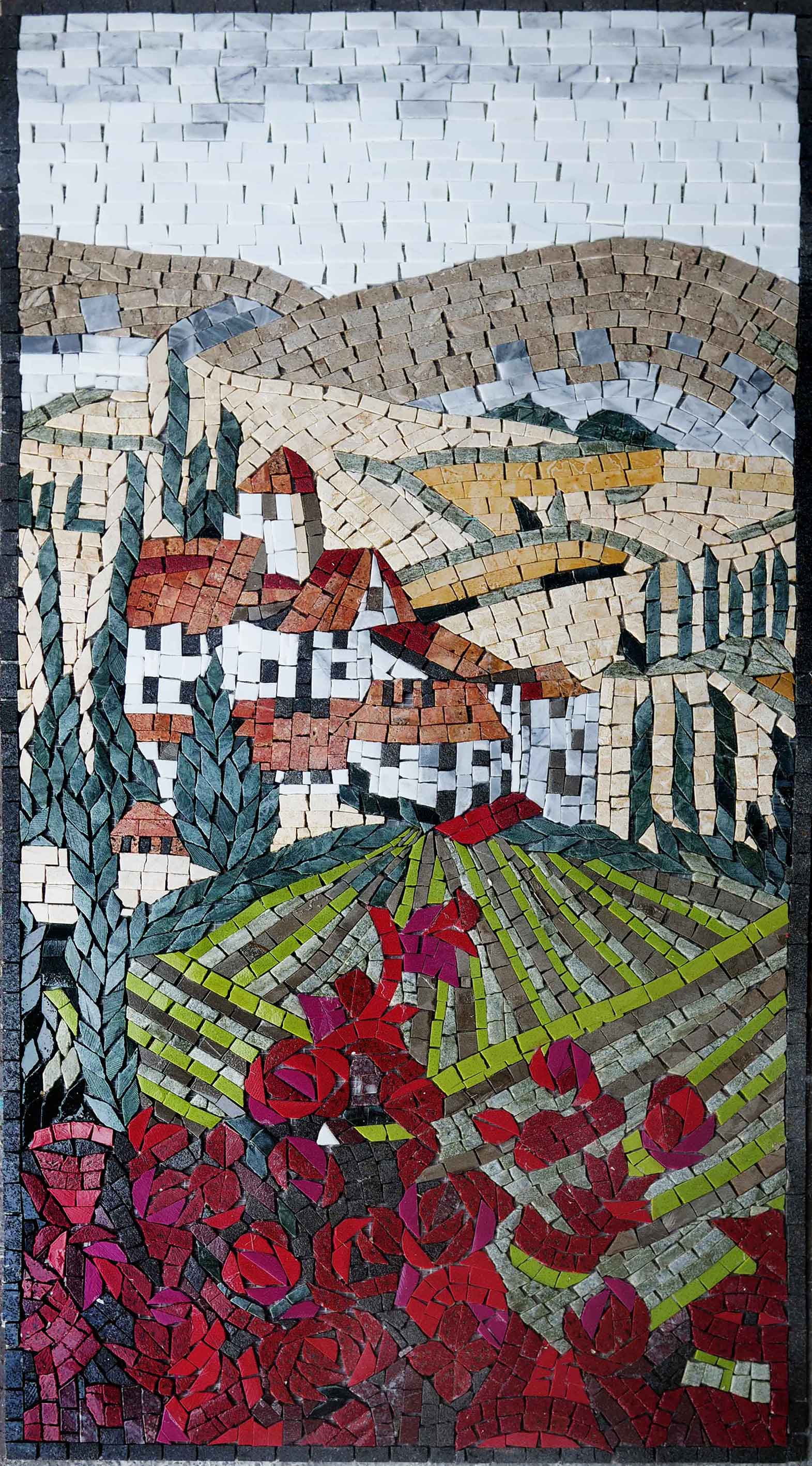 Elevate your home aesthetics with this enchanting mosaic scenery that resonates with inspiring natural landscapes. Celebrate the beauty of the countryside and the great outdoors right from the comfort of your own home. Add this timeless piece to your cart today and let the "Houses and Mountains - Mosaic Scenery" transport you to a peaceful paradise every time you gaze upon it.