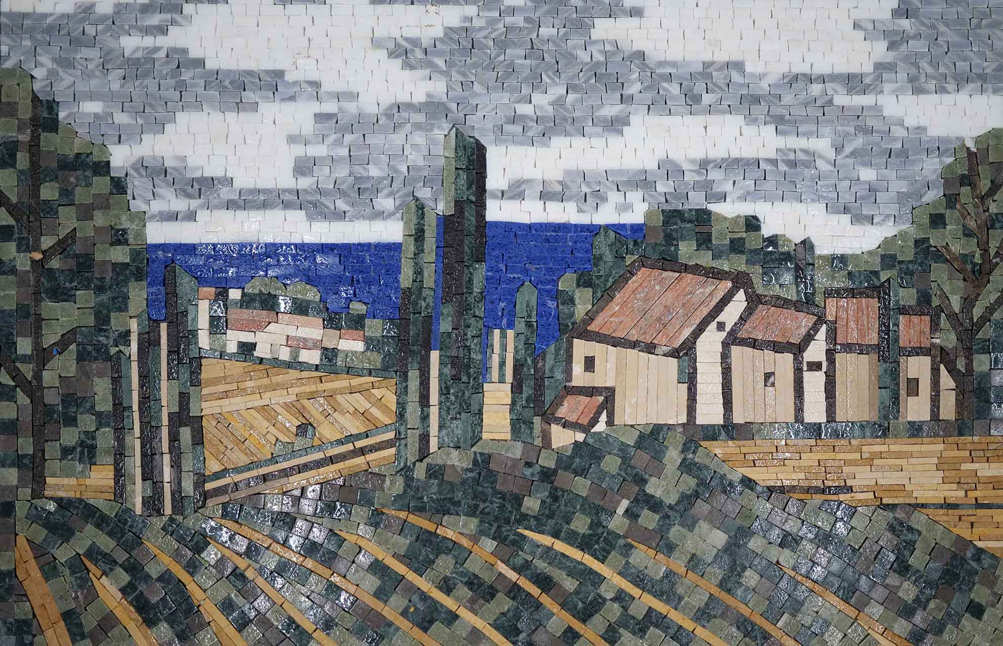 Crafted entirely by hand, this mosaic is a labor of love made from premium marble stones, ensuring not only a captivating aesthetic but also durability that will stand the test of time. The intricate details of the houses, the interplay of colors, and the natural textures of the stones come together to create a visual masterpiece that will enhance any wall it graces.
