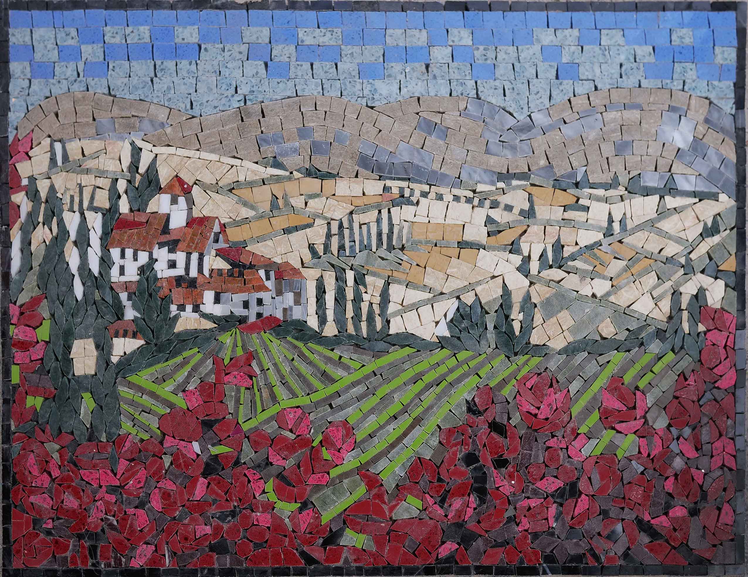Introducing the Mosaic Wall Art - Tucsan Mosaic Design, a stunning piece that brings the enchanting charm of Tuscan landscapes into your home. Crafted from natural stones, this exquisite handmade mosaic art beautifully illustrates the rolling hills, rustic villas, and vibrant flora characteristic of Tuscany, making it a perfect addition to both indoor and outdoor spaces.