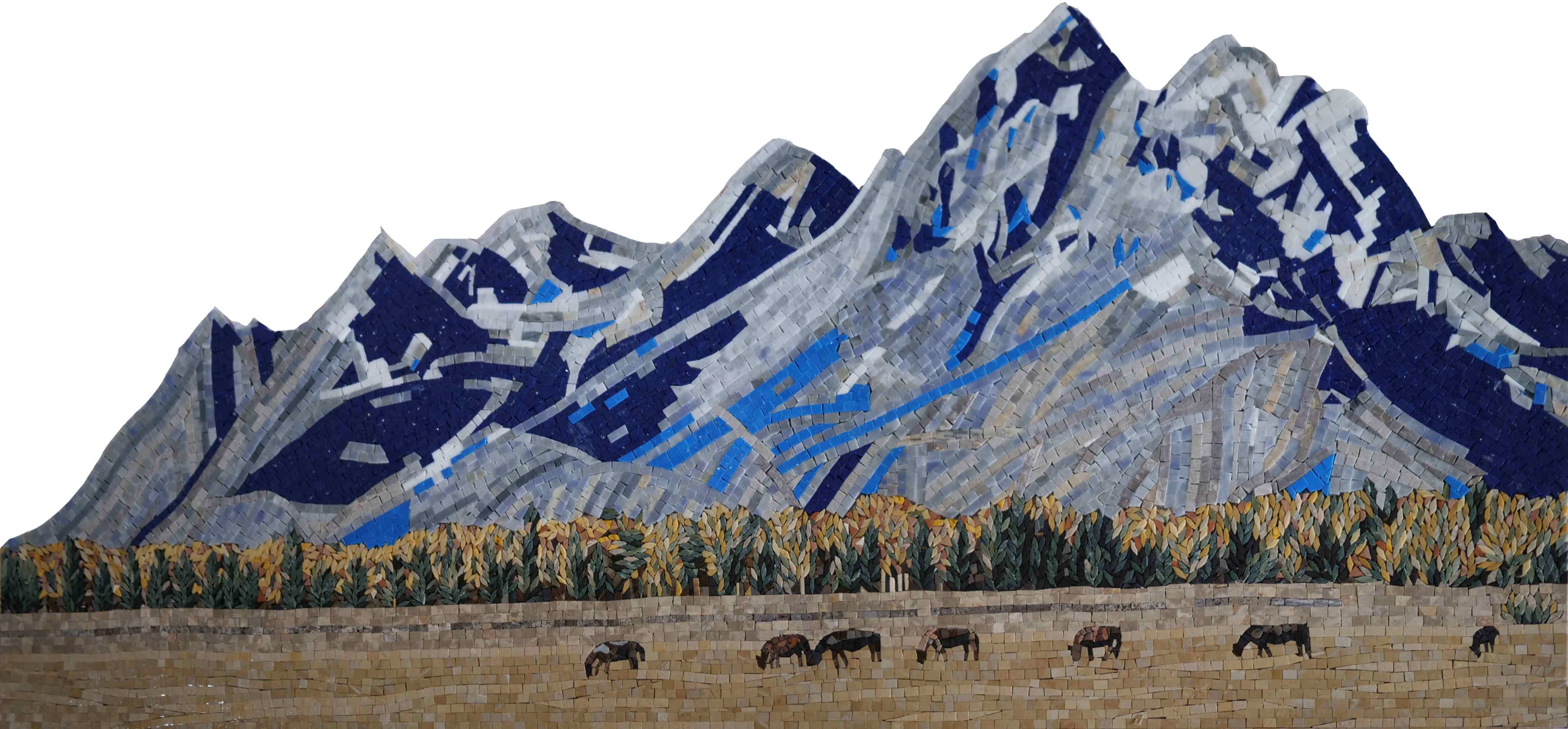 As you gaze upon this artwork, you’ll be drawn to the majestic mountains towering in the background, their rugged peaks standing proud against a sky that shifts in shades of blue and gold. The intricately detailed horses grazing peacefully in the distance add a sense of life and movement, reminding us of the connection between nature and wildlife. Each element has been meticulously crafted to ensure a harmonious blend of colors, shapes, and textures, resulting in a panorama that feels both dynamic and calming.