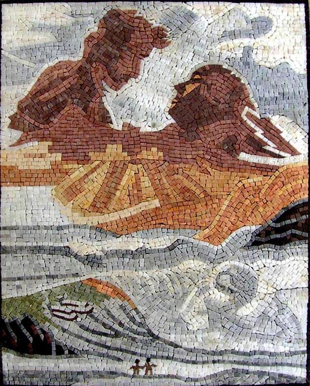 MS190 is a marble mosaic art work that is fully handmade and composed of natural stones and tiles. This mosaic piece shows two silhouettes looking at each other within the dunes of the desert.