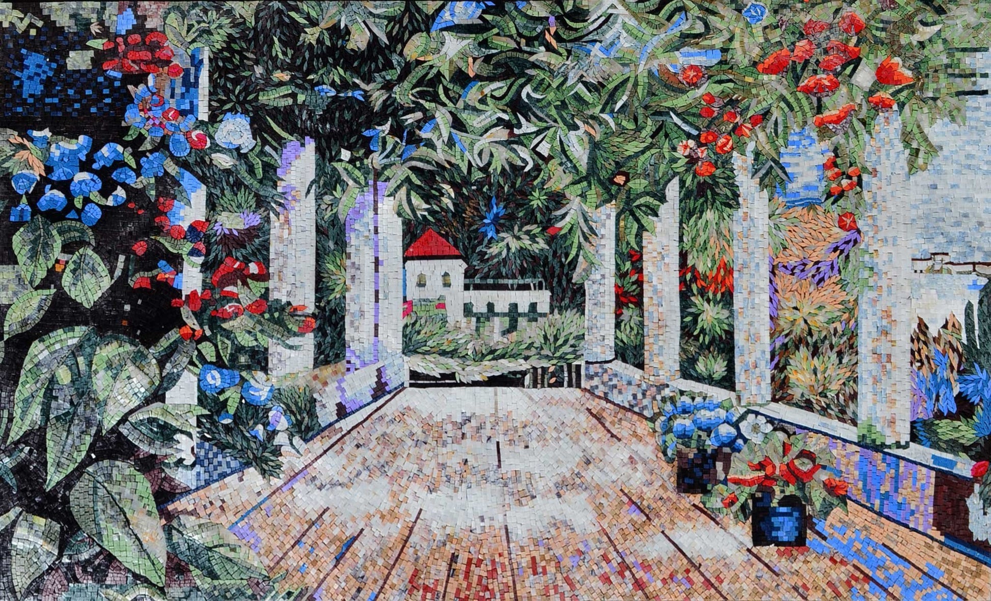 A marble mosaic Tuscan mural amazingly detailed showing a patio with wooden floors displayed in beige colored tiles with white columns on the sides decorated with green plants and red and blue flowers. At the end of the patio we see a white house.Very beautiful natural scene that makes you want to escape your worries! It is ideal on any room wall for indoor decoration and outdoor.
