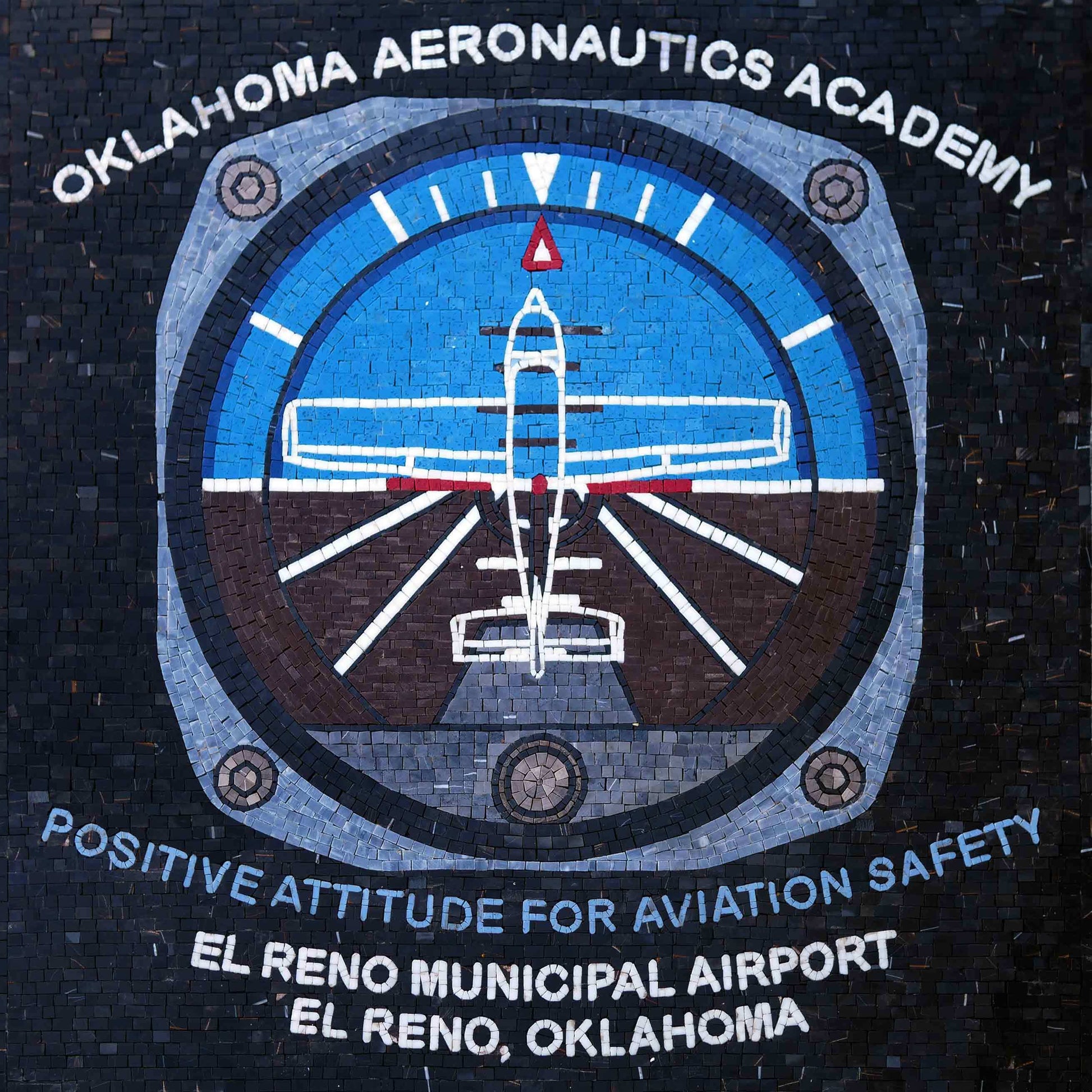 This stunning mosaic sign showcases a vibrant and detailed depiction of an aircraft instrument panel. The circular design features a central altimeter, surrounded by a compass rose and various aviation-themed elements. The mosaic is crafted with meticulous attention to detail, using a variety of colorful tiles to create a visually striking and informative artwork. The sign proudly displays the name "Oklahoma Aeronautics Academy" along with the message "Positive Attitude for Aviation Safety." The mosaic is installed at the El Reno Municipal Airport in El Reno, Oklahoma.