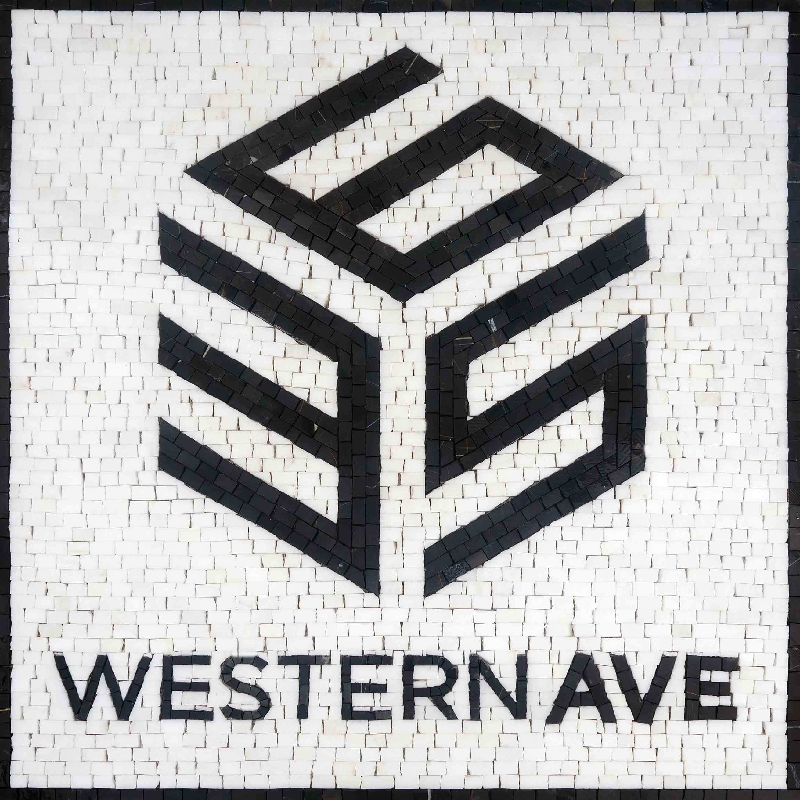 This striking mosaic art piece features a bold, geometric logo design in contrasting dark tiles against a lighter background. Below the logo, the text "WESTERN AVE" is clearly displayed. Handcrafted from individual stone tiles, this mosaic offers a modern and minimalist aesthetic. Perfect for businesses or individuals located on or with a connection to Western Avenue, or those who appreciate clean, contemporary design. The tactile nature of the stone adds a unique element to this eye-catching artwork.