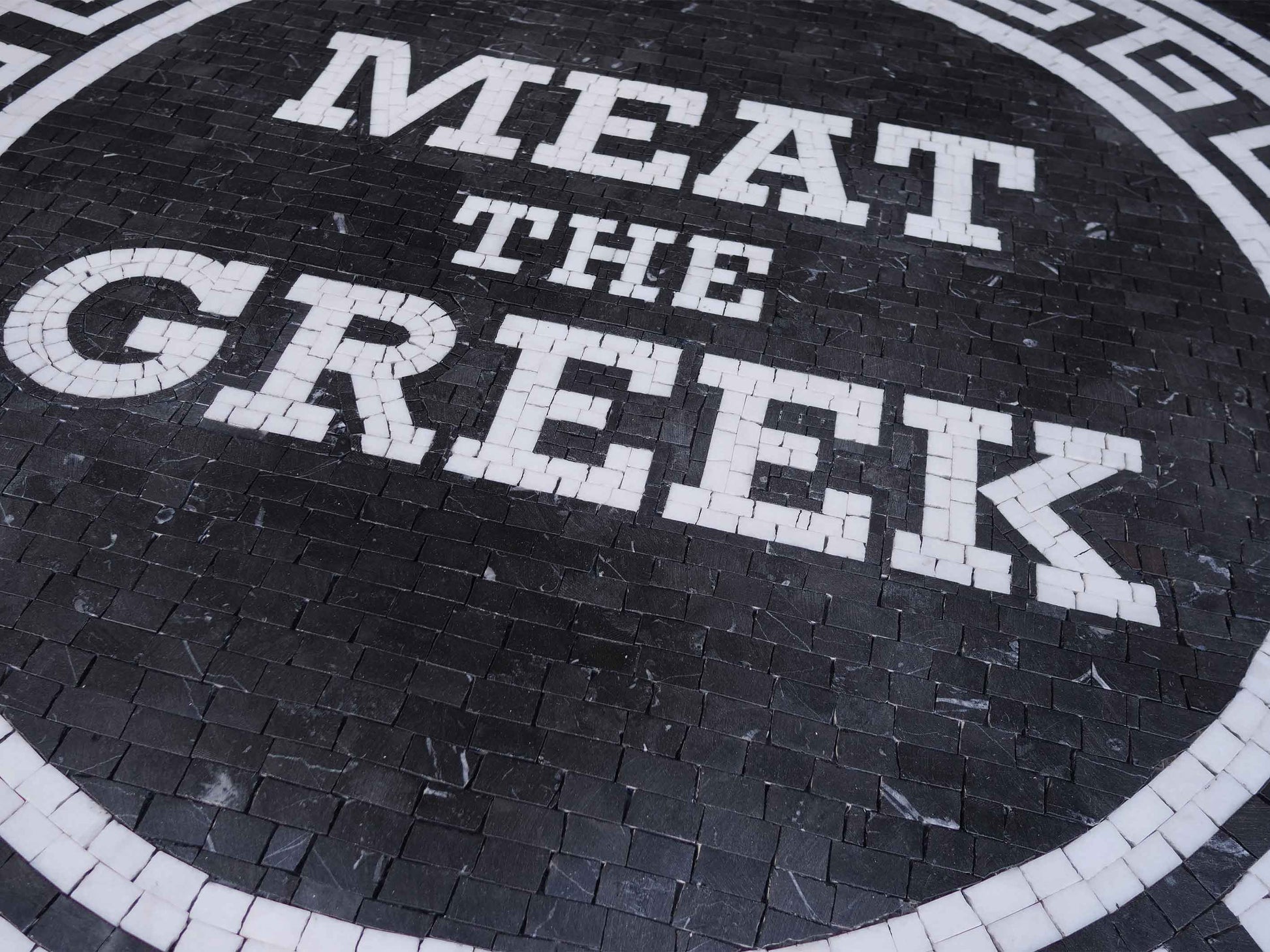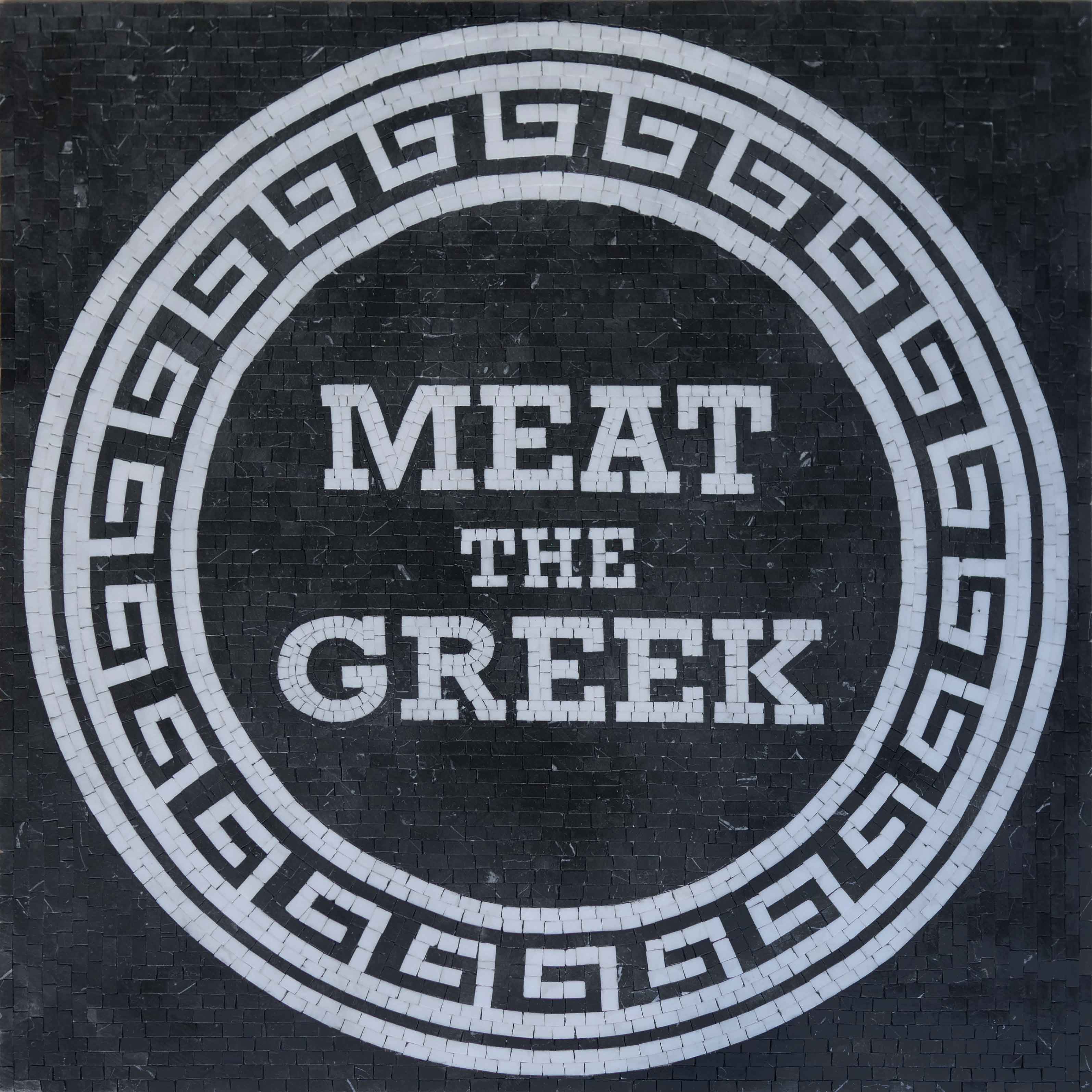 Originally created for commercial use, including a prestigious restaurant logo, this mosaic features a striking black background that truly makes the artwork pop. Surrounding this bold center is a classic Roman mosaic border in pristine white, complementing the darker hues while invoking a timeless elegance characteristic of ancient artistry.